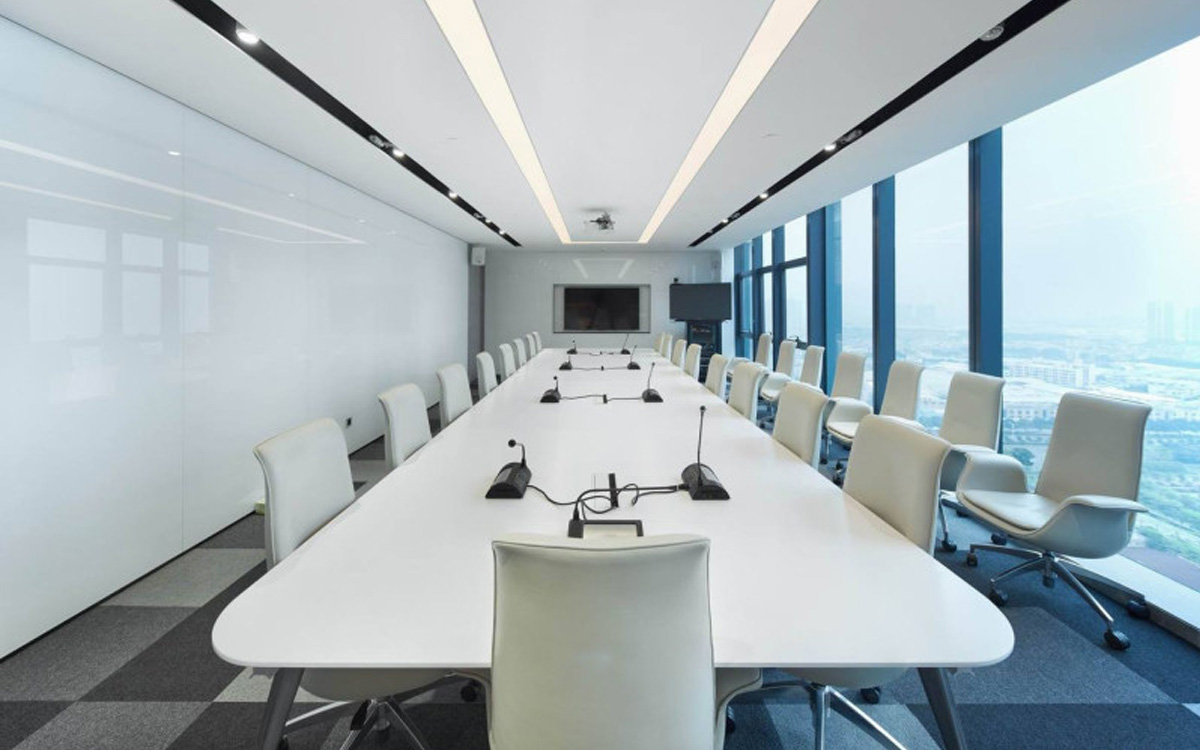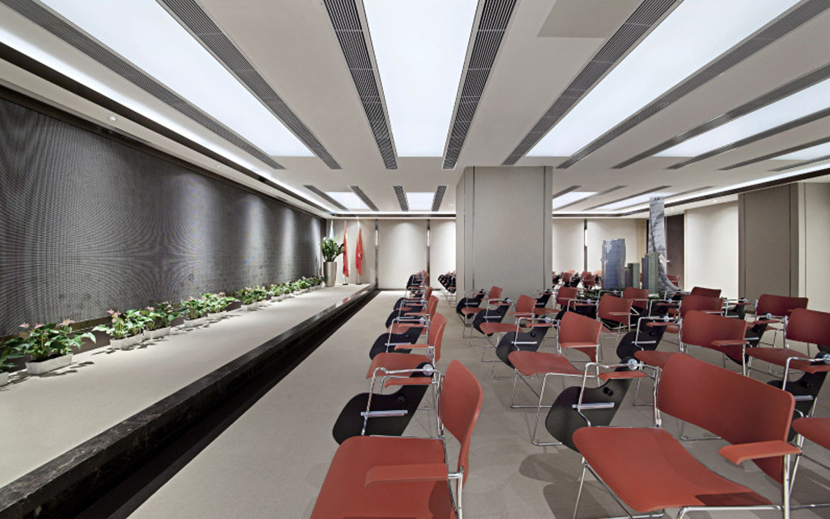 唯一有区别的就是该客户他们需要一个保密室,需要做到单独的监控和网络,并用实体砖墙,整体效果非常的现代,用红色作为点缀,黑色线条作为线面装饰,地面用浅色地砖。