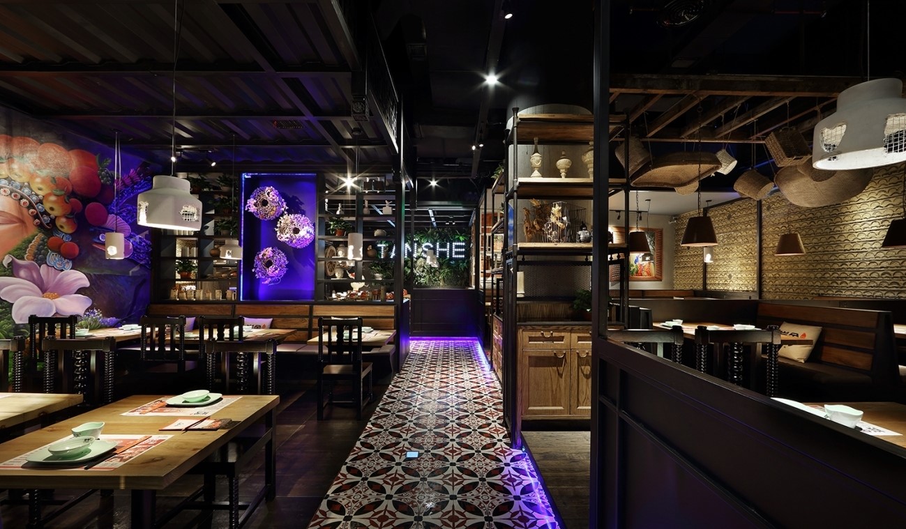 炭舍,是一个坚持传统风味与现代工艺相结合的干锅餐厅,本案以天府之国四川的地域风情、人文特色和建筑精髓为气质导向,设计师利用现代稳重手法,结合材料及工艺,将川式建筑中常见的穿斗式屋架造型简化为隔断框架运用于餐厅中,使得平面布局灵活,空间变化有序。另外,本案延续了炭舍以往的轻工业风,大量使用气质冷硬的黑色钢架,并用颜色活泼的水彩画来软化钢板的冷酷气息,营造出休闲怀旧的用餐空间