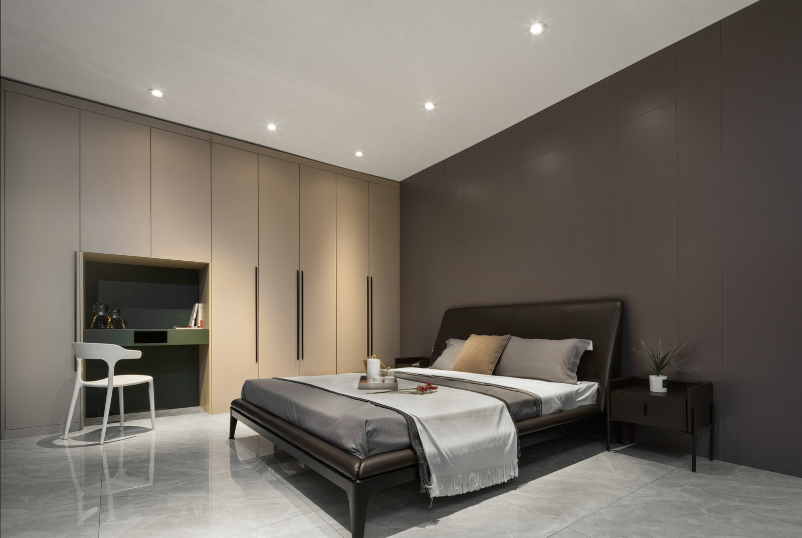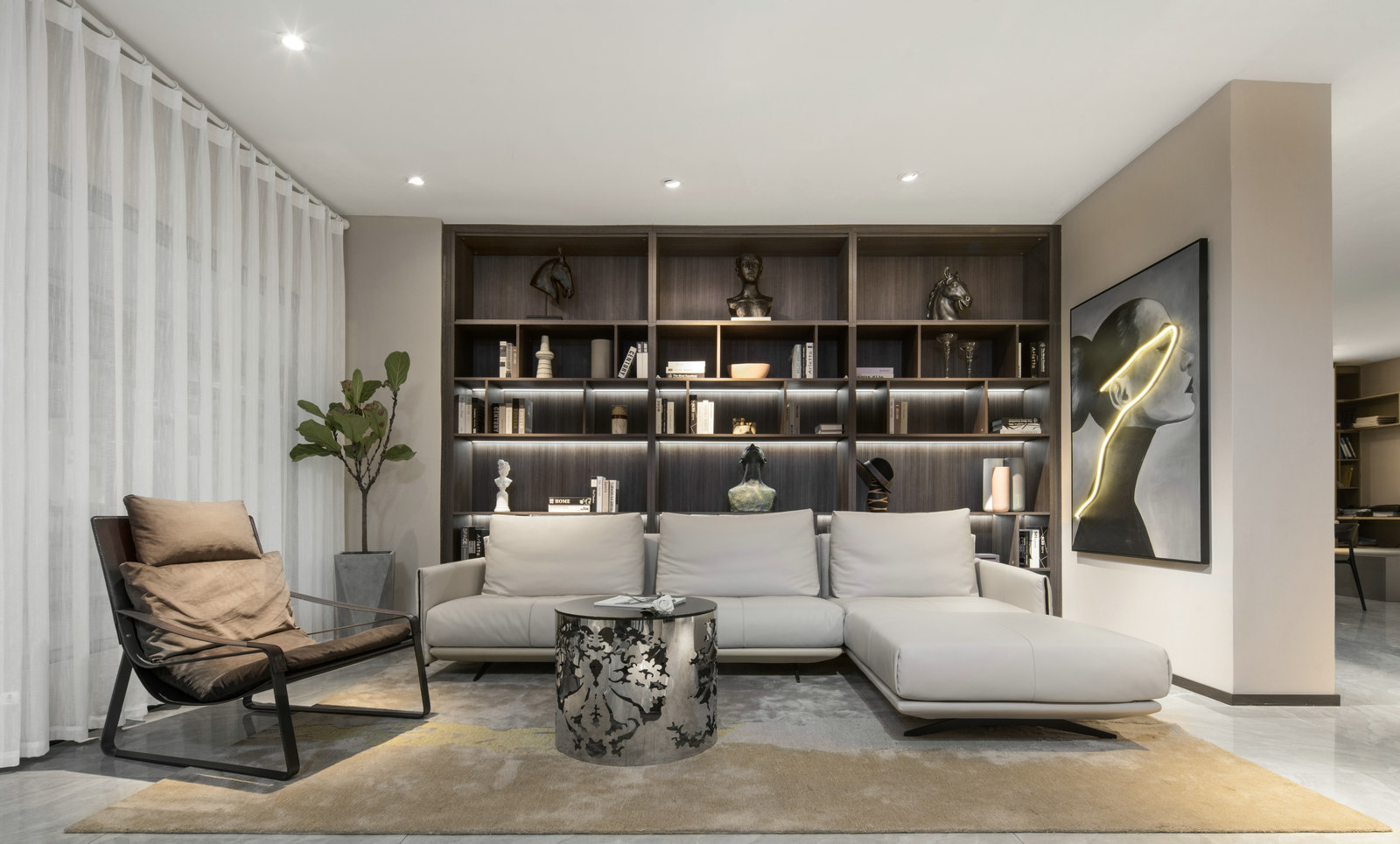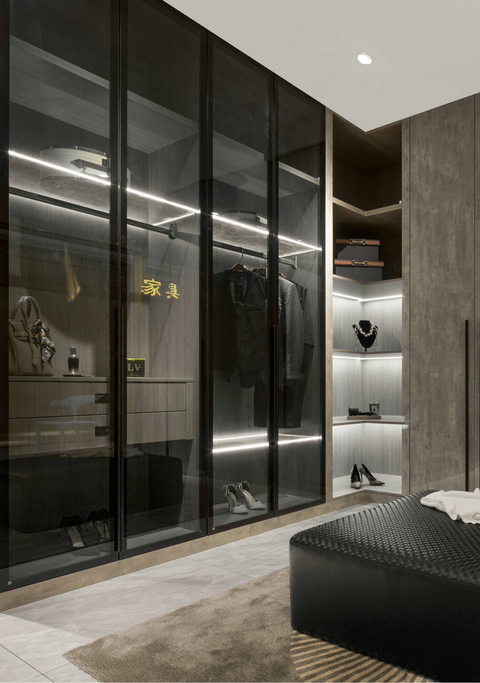 本案为HK.A全屋定制展厅,设计师以现代轻奢风格呈现,强调细节,目光所及都是舒服时尚的气息。轻奢代表一种优雅、格调和对生活品质的追求。用k木饰面、金属线条等不同的材质来赋予空间高级感。