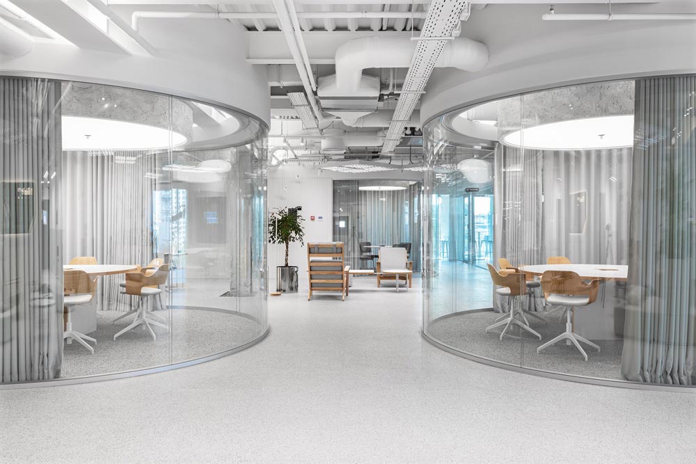 IT科技、厂房改造、生态工作系统、模块化家具、盒中盒、时尚优雅白色调,该项目的设计概念是创建一个可随时微调、具有超强适应性的生态工作系统,这样即使在不确定的疫情期间也能优化工作流程和效率。
