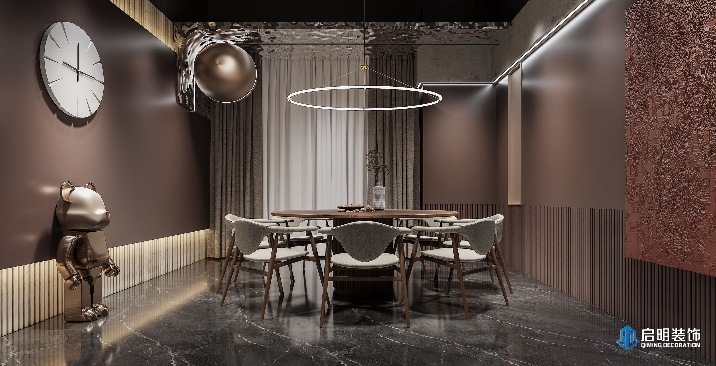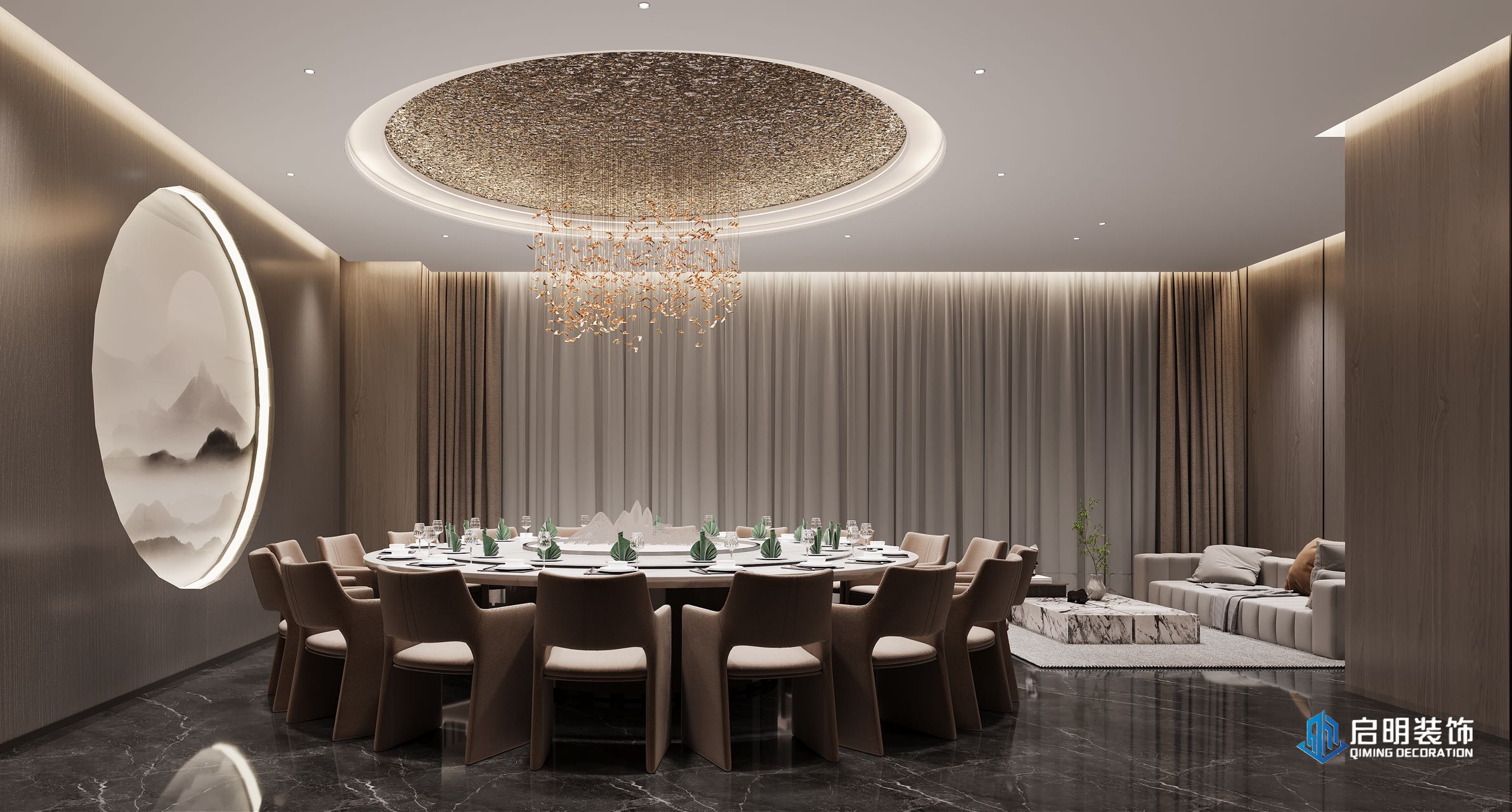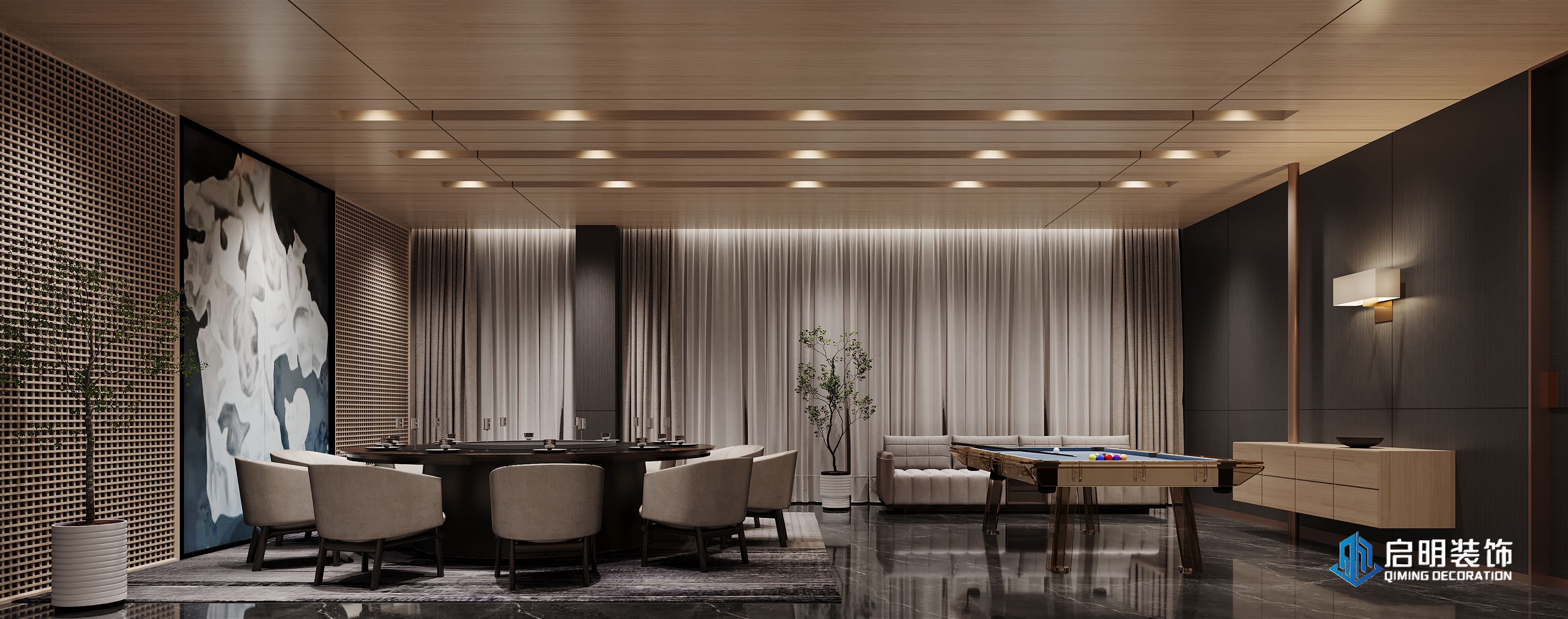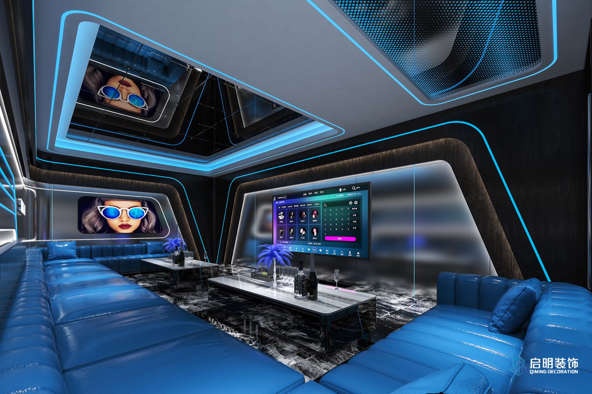 整体高端定位,私人会所作为尊贵的社交场所,应具备高端、典雅的氛围。在设计中,我们注重品质、档次和品味,以满足高层次人群的需求。 注重艺术氛围的营造,运用艺术作品、装饰品等元素,彰显会所的文化底蕴。此外,还通过空间布局、家具选用等方式,体现业主的审美观。 设计KTV的过程中,关注每一个细节,从墙面、地面、天花板到家具、灯具等,都精心设计。针对不同主题选用不同的高品质的装饰材料和家具,以提升会所的整体品质。 KTV区域采用隔音材料,保证客户在唱歌时的私密性。餐桌区域则注重餐饮体验,选用高品质的餐桌、椅子和餐具,给客户营造出舒适、高雅的用餐环境。