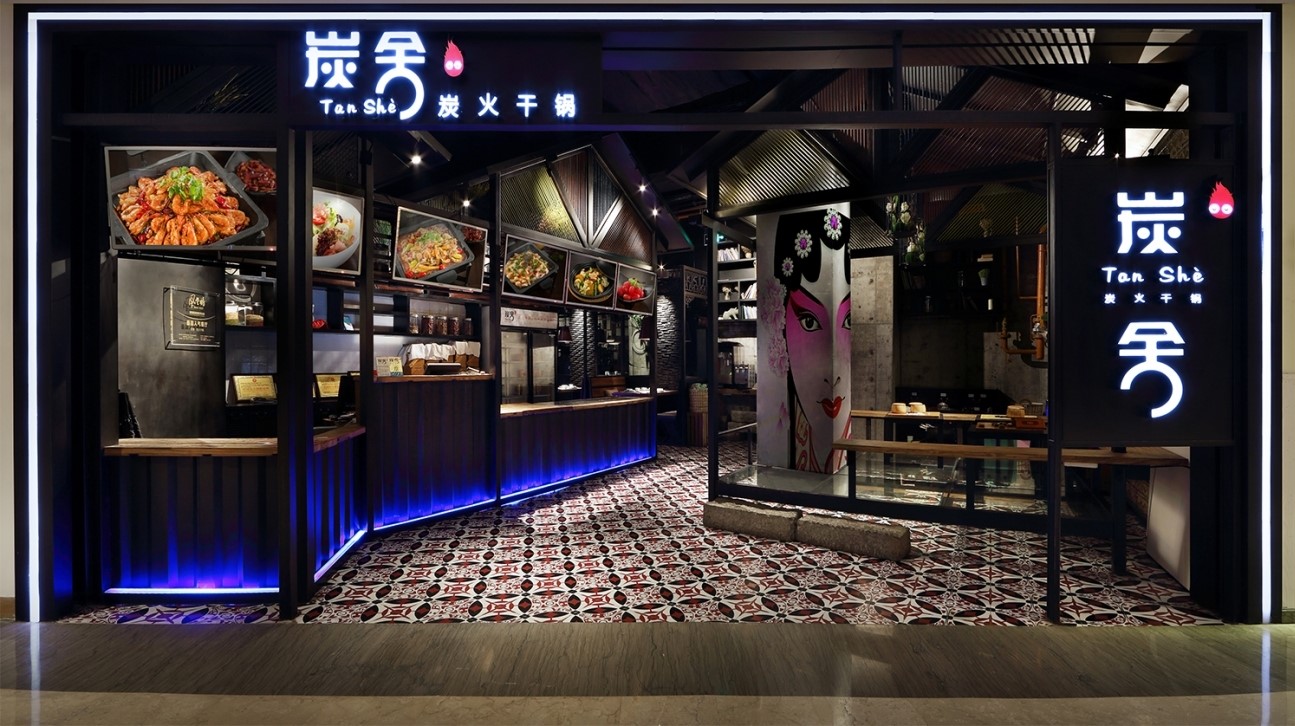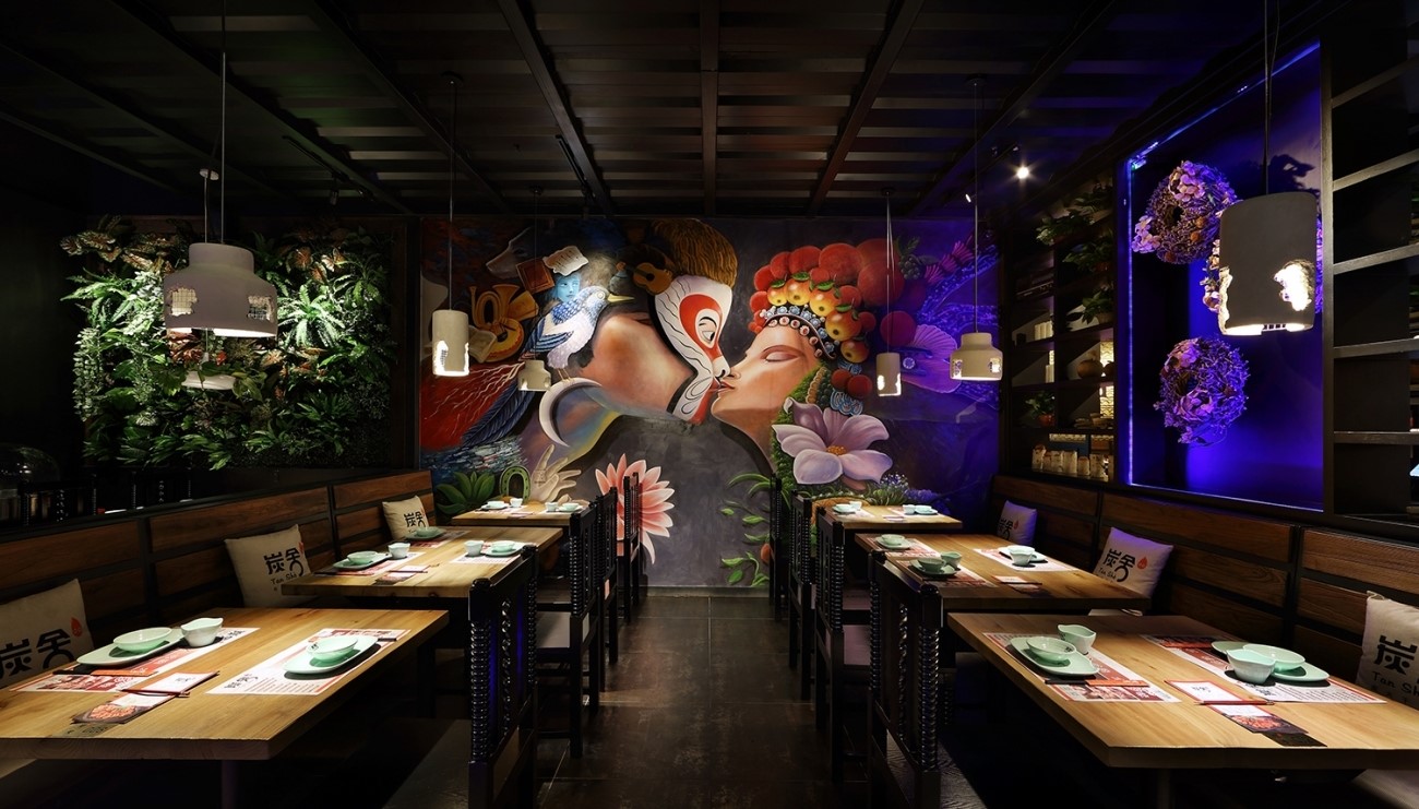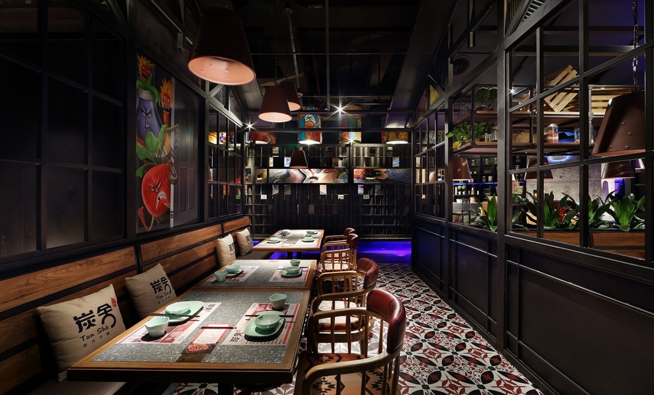 炭舍,是一个坚持传统风味与现代工艺相结合的干锅餐厅,本案以天府之国四川的地域风情、人文特色和建筑精髓为气质导向,设计师利用现代稳重手法,结合材料及工艺,将川式建筑中常见的穿斗式屋架造型简化为隔断框架运用于餐厅中,使得平面布局灵活,空间变化有序。另外,本案延续了炭舍以往的轻工业风,大量使用气质冷硬的黑色钢架,并用颜色活泼的水彩画来软化钢板的冷酷气息,营造出休闲怀旧的用餐空间