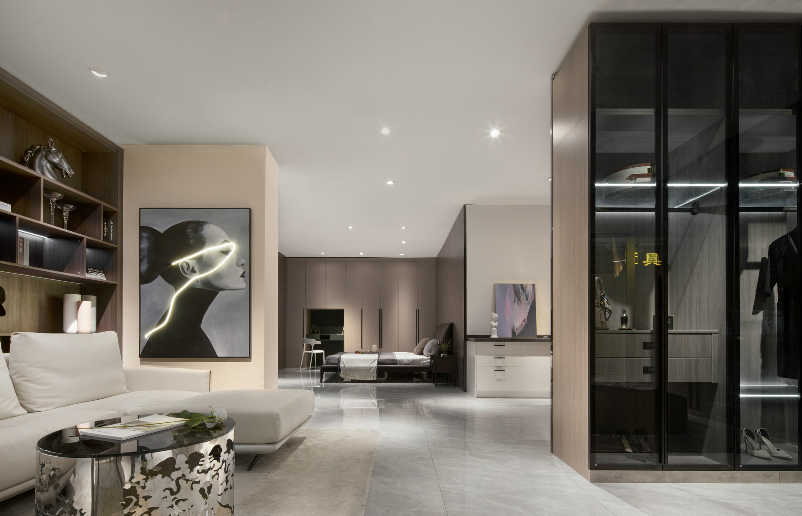 本案为HK.A全屋定制展厅,设计师以现代轻奢风格呈现,强调细节,目光所及都是舒服时尚的气息。轻奢代表一种优雅、格调和对生活品质的追求。用k木饰面、金属线条等不同的材质来赋予空间高级感。