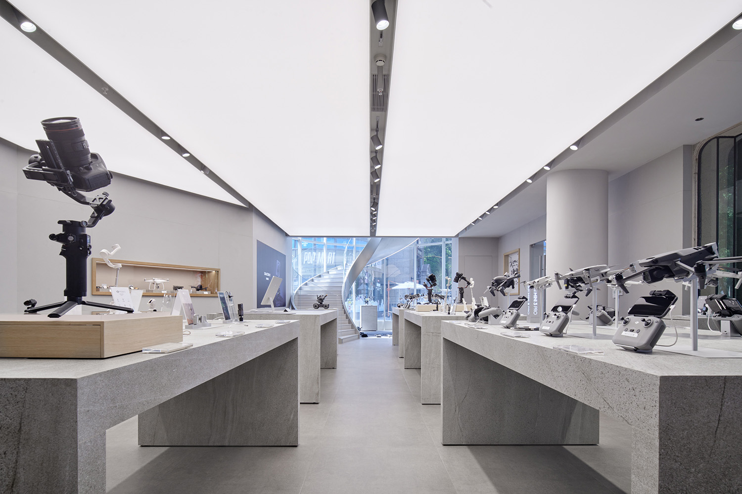 大疆线下门店装修。 强调未来科技与永恒经典相融合,打造一个有品质感的博物馆展陈空间,室内由灰色石材构成纯粹的容器,精致的产品整齐均匀的陈列在“巨石”上,所有的展示陈列道具均由石材制作,形成规律稳定的石块矩阵,均质的空间使产品更加突显。