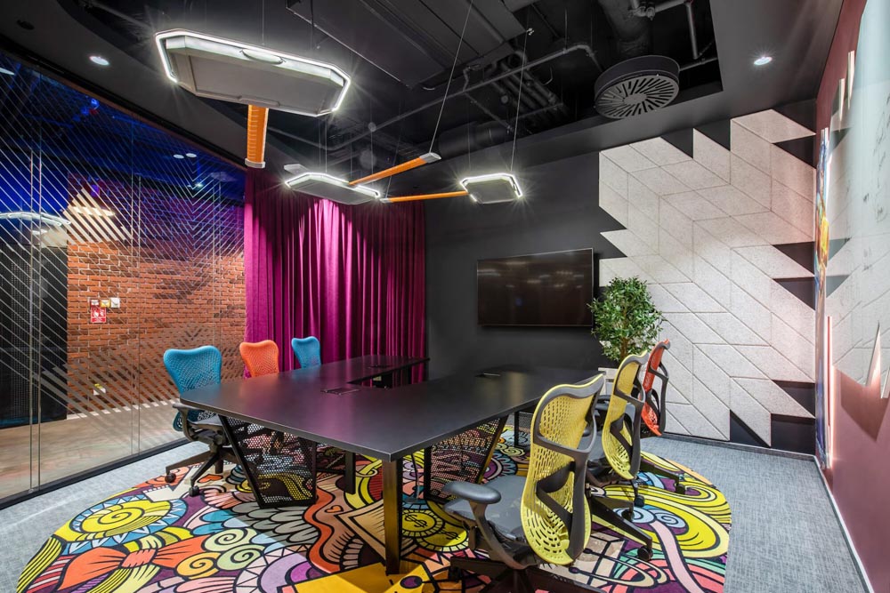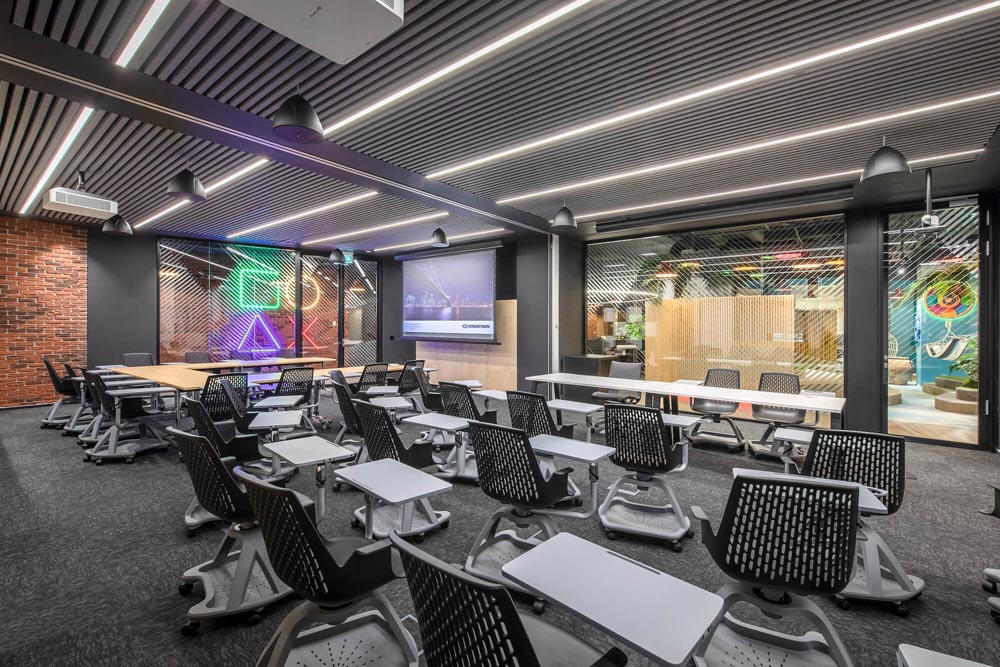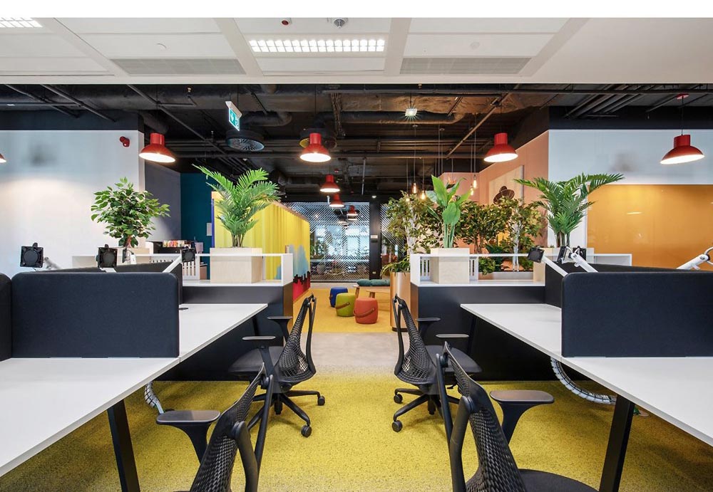 游戏场景、开放协作多元、绿植、休闲工业风,空间以鲜明的色彩配,以特别定制的照明设备加以强化和凸显,为员工塑造一个亲和舒适、充满创意的工作环境。