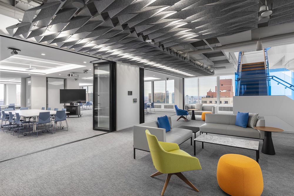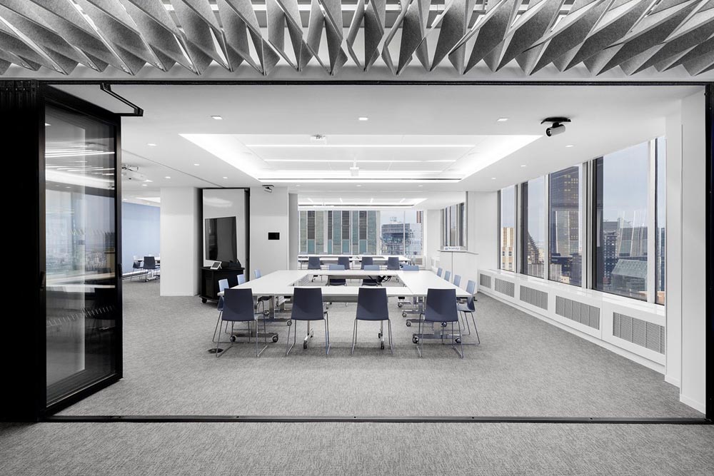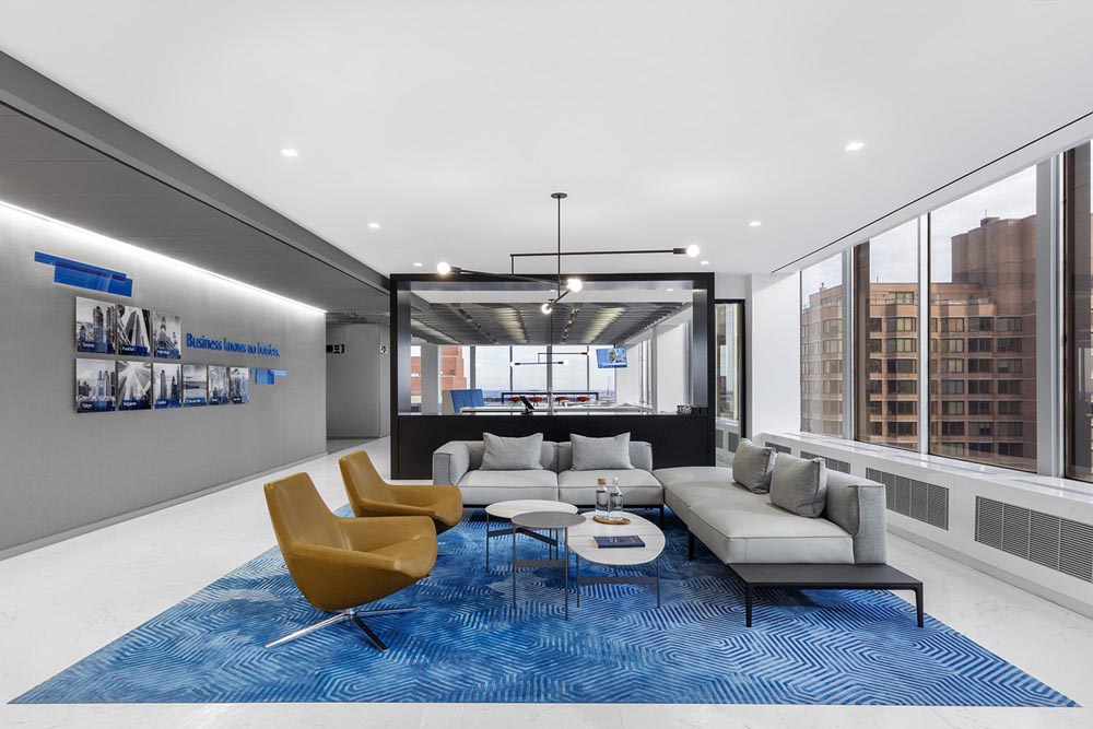 科技、前沿科技应用、开放协作多元、品牌诠释、简约摩登、原木、蓝色,设计团队将移动应用等前沿技术兼容进各大型和小型的会议室中。同时主会议区域兼做工作区来使用,打造透明、技术和协作文化的空间。
