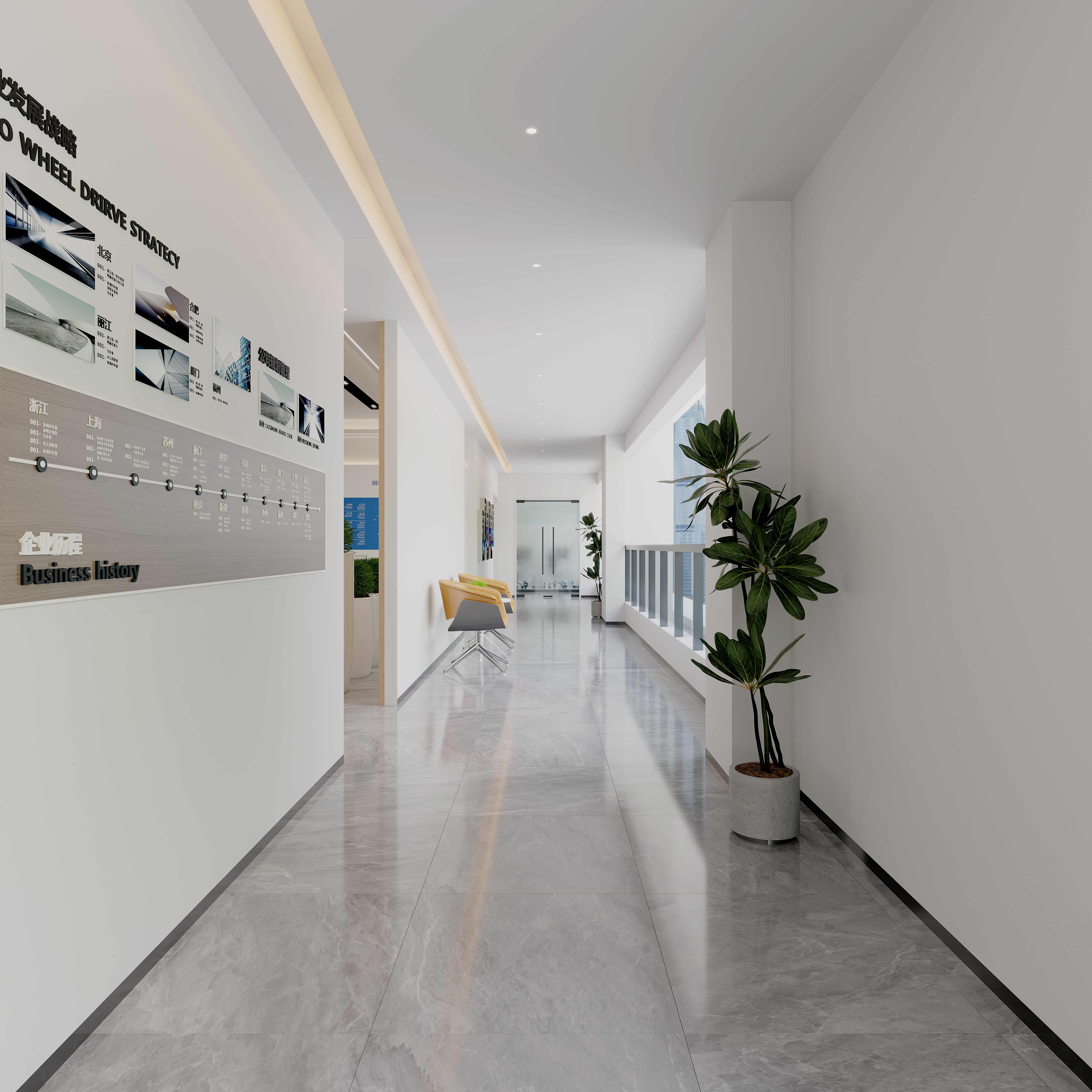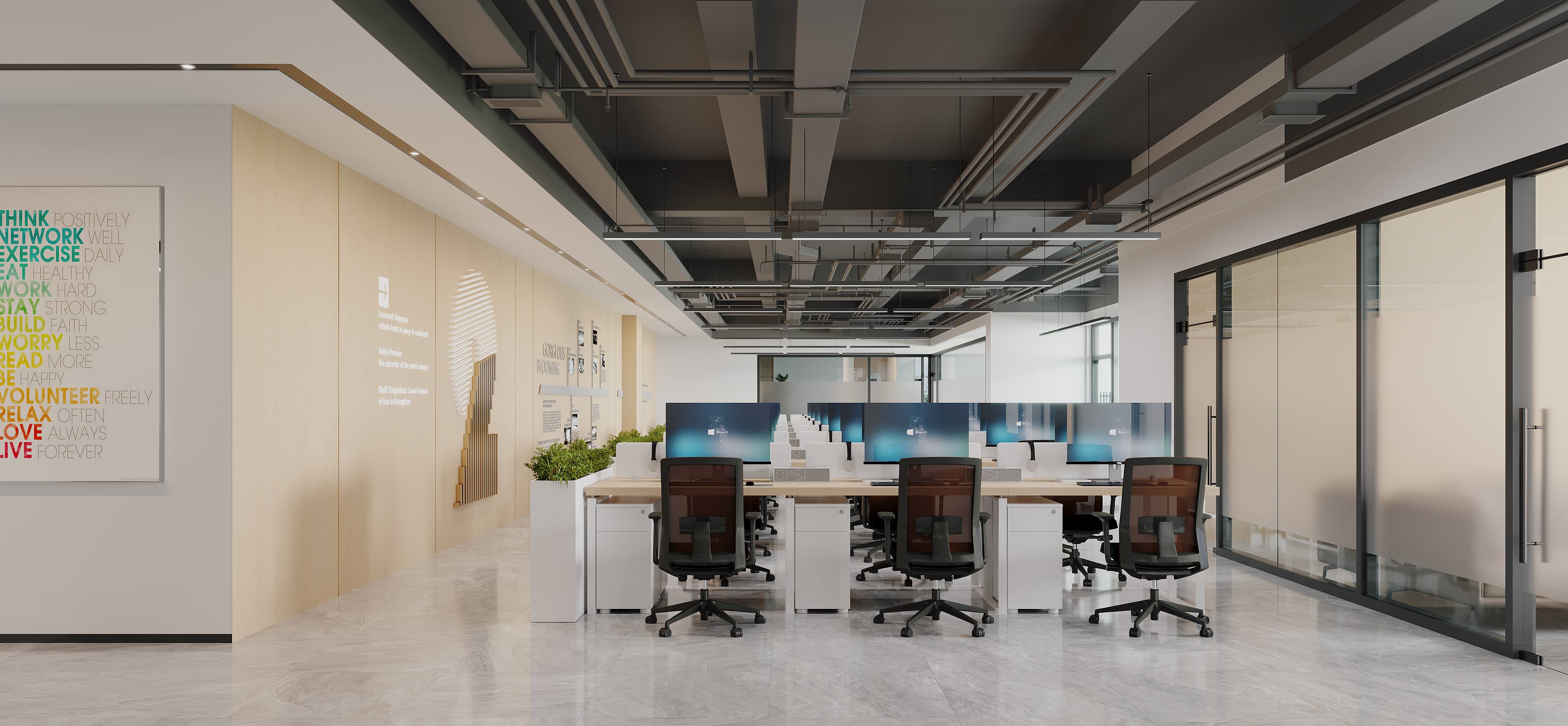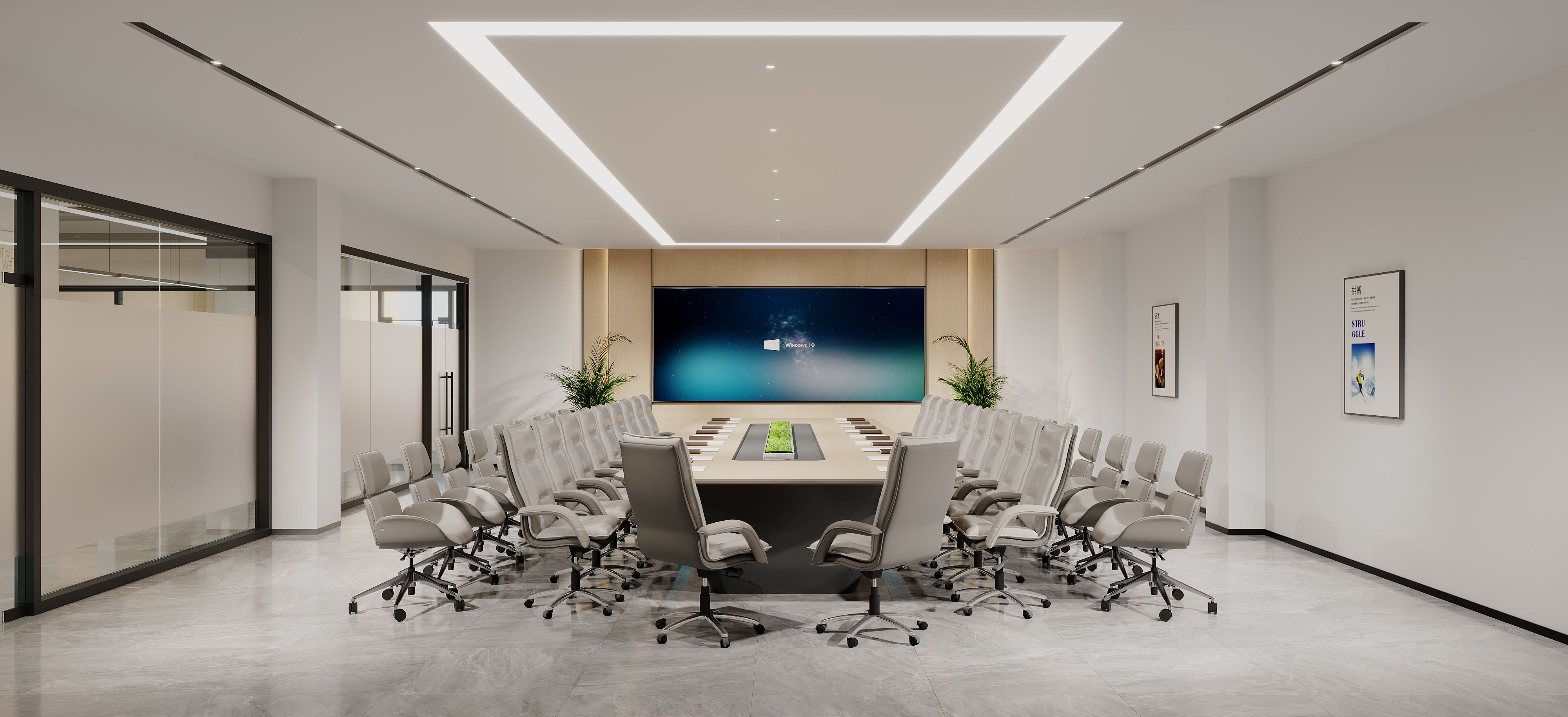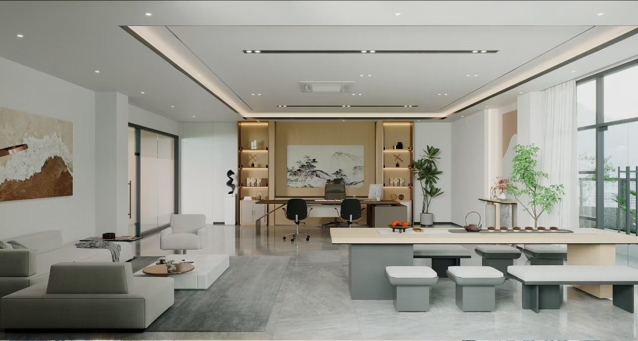 大面积的落地窗让自然光线充分进入室内,不仅可以提高室内的亮度,还能让员工享受到外面的城市景观,减轻工作压力 以白色和原木色的组合是现代风格的经典配色方案。这些颜色不仅使空间看起来更加简洁大方,而且还能够很好地反映出现代时代的氛围
