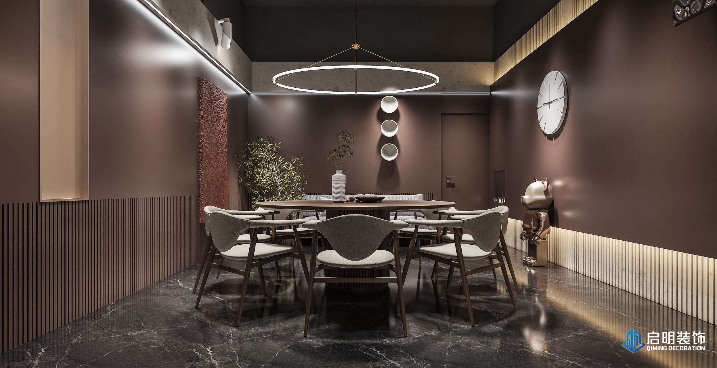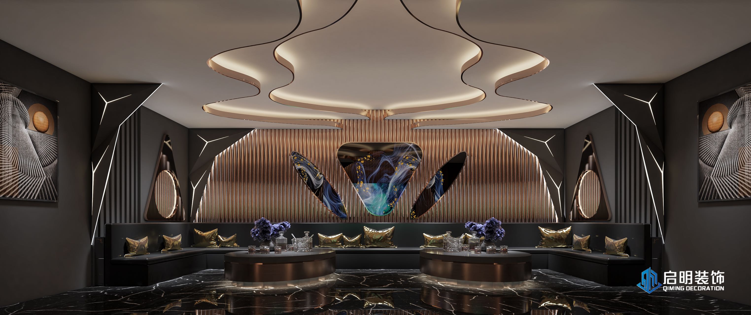 整体高端定位,私人会所作为尊贵的社交场所,应具备高端、典雅的氛围。在设计中,我们注重品质、档次和品味,以满足高层次人群的需求。 注重艺术氛围的营造,运用艺术作品、装饰品等元素,彰显会所的文化底蕴。此外,还通过空间布局、家具选用等方式,体现业主的审美观。 设计KTV的过程中,关注每一个细节,从墙面、地面、天花板到家具、灯具等,都精心设计。针对不同主题选用不同的高品质的装饰材料和家具,以提升会所的整体品质。 KTV区域采用隔音材料,保证客户在唱歌时的私密性。餐桌区域则注重餐饮体验,选用高品质的餐桌、椅子和餐具,给客户营造出舒适、高雅的用餐环境。